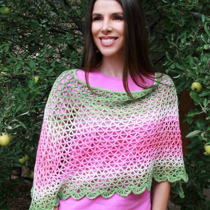 Filigree is an airy, lightweight topper. Made with a wide-open triangular mesh, this top is worked in the round with just two increase points, similar to a poncho. We love it in cotton but imagine using a fingering weight rayon yarn with sparkle for a dressy evening topper. With a one-row repeat until the edging, you can make this project in just a single weekend!