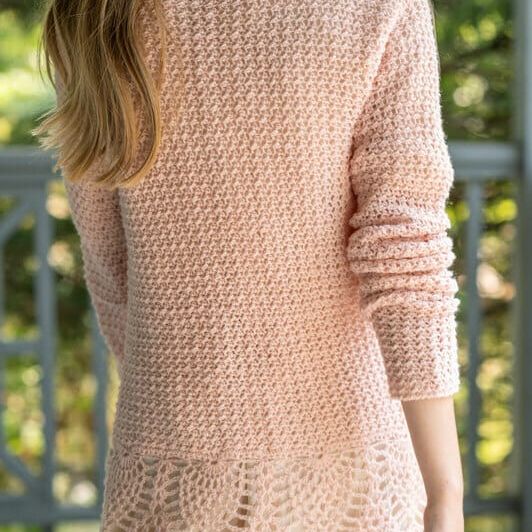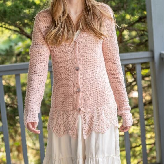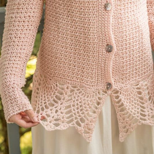 The Pineapple Cardi is a gorgeous cardigan – the perfect layering sweater. Made with laceweight yarn, it is light to wear yet fends of the chill. Wear over a tank top and jeans for a casual day shopping or a skirt and shell for a lovely professional look for work.