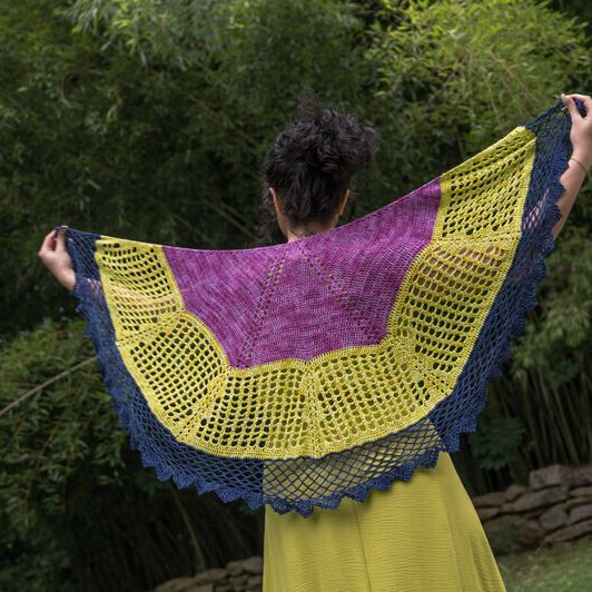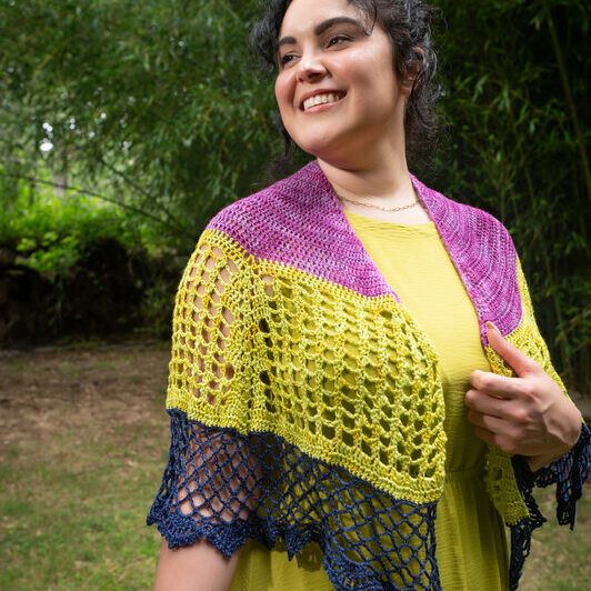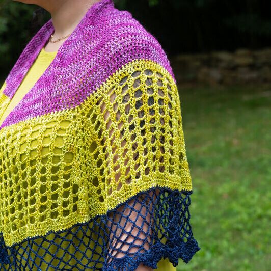 The journey begins with a solid section worked in a beautiful raspberry, a juicy pink that highlights the elegant shell corner details. This section creates a cozy, structured start with just enough visual interest to keep things fun. From there, the color shifts to a glowing golden cluster lace—warm, sunny, and open enough to let the bamboo shine (literally—it has such a lovely sheen!). Finally, you’ll transition into a delicate lace net in deep blue. The darker tone adds depth and drama, resulting in a bold and beautiful finish.